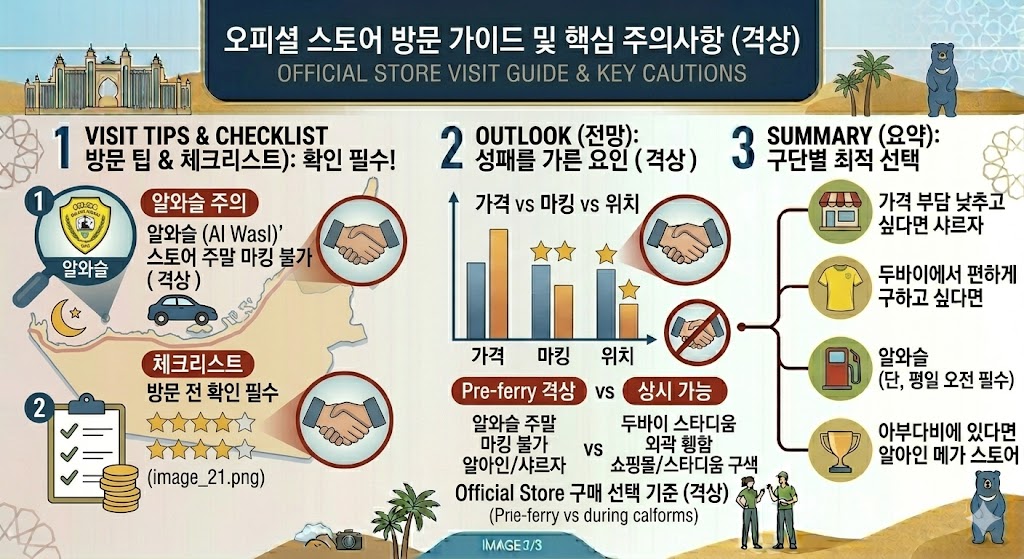 한 가지 중요한 주의사항이 있습니다. 다른 두 곳과 달리 알와슬 스토어는 마킹 담당자가 외부에서 출장 오는 방식으로 운영됩니다. 마킹은 월요일부터 금요일 오전까지만 가능하고, 주말에는 사실상 불가합니다. 일정이 타이트한 방문자라면 반드시 사전에 확인하고 가는 것을 권합니다.